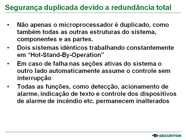 O sistema SecuriFire 3000 oferece uma proteção contra incêndios dificilmente superada por outros sistemas de detecção de incêndios. Todos os componentes – desde os microprocessadores até o sistema operacional – estão presentes em duplicidade.